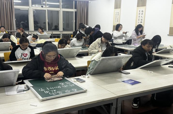 活动现场,同学们全然投入笔墨世界,心无旁骛。从横、竖、撇、捺等基础笔画练起,到完整汉字的构形书写,大家反复琢磨、精益求精。小黑板上密密麻麻的字迹,正是每一份努力与坚持的见证。