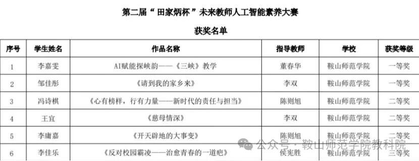 近日,由辽宁省教育事业发展联盟主办、辽宁师范大学承办的第二届“田家炳杯”未来教师人工智能素养大赛落下帷幕,我校选派来自人文与传播学院、教育科学与技术学院的6名学生参加省内复赛。决赛中,我校选手凭借出色的数字素养和教育创新能力,在众多选手中脱颖而出,取得了优异的成绩:斩获一等奖2项,二等奖3项,三等奖1项!