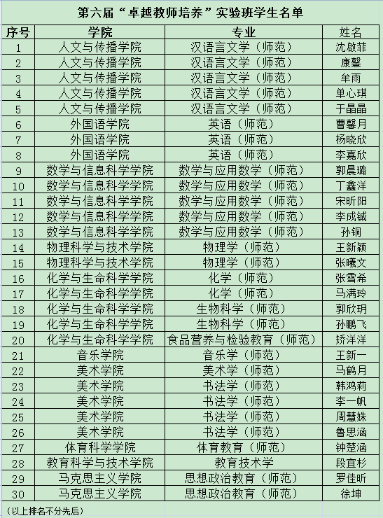 经过评委评审,现将第六届卓越教师培养实验班学生名单公布如下: